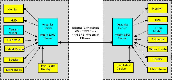 Each transmitting commander’s body language and gestures are also captured by motion capture devices and optional glove peripherals, converted to a set of gestures, and transmitted as a code using an additional 600 BPS. These codes are used to render the speaker’s 3D-body model, or avatar at the receiving node, and also to select and manipulate objects within the virtual environments. The system components necessary for the implementation of a VCP node are shown in Figure 3.