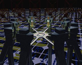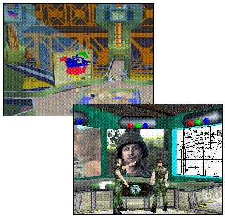 To be fully useful for battlefield collaboration as shown in Figure 6, the VCP demonstration system must have the proper “look and feel” of a battlefield command post. Commanders engaged in tactical warfare will not use equipment that seems toy-like or unrealistic. Professional graphic designers carefully storyboarded the VCP system, modeling both the interior of the command and the appearance of commander’s avatars. Army Commanders and knowledgeable developers were solicited to aid in the design and selection of the environment and models. Texture-mapped graphics were designed to facilitate a realistic, collaborative environment acceptable to commanders involved in battlefield management activities. A Compelling Battlefield ModelCommunication of the Commander’s “Vision of the Battlefield” was one of the most important concepts this program addressed. The VCP constructed in this Phase II effort has a working interface to a terrain database model. This allowed the design team to construct a three dimensional model of the battlefield within the command post environment.